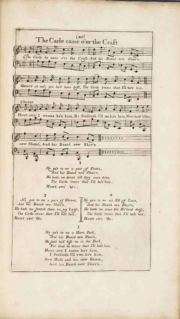 Sheet music for 'The Carle came o'er the Craft' from 'Orpheus Caledonius', or a collection of the most celebrated Scotch songs. Compiled by William Thomson and printed in 1725. This page was copied from the National Library of Scotland website. Orpheus Caledonius is described on the NLS website as the first printed collection of Scottish songs united to their melodies.